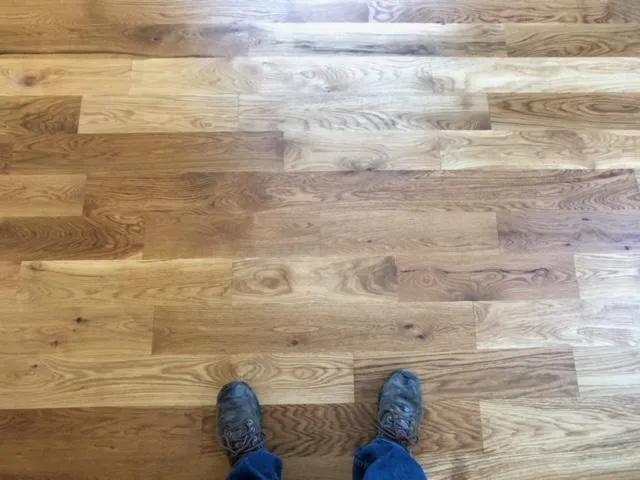 Live Sawn Random Width White Oak character grade finished with hand rubbed finish in Powells Point, NC