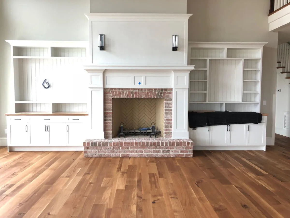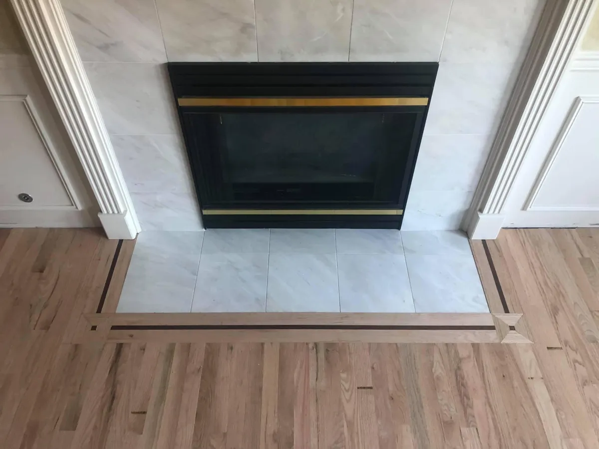 Custom border around this fireplace with red oak floors in Southern Shores, NC